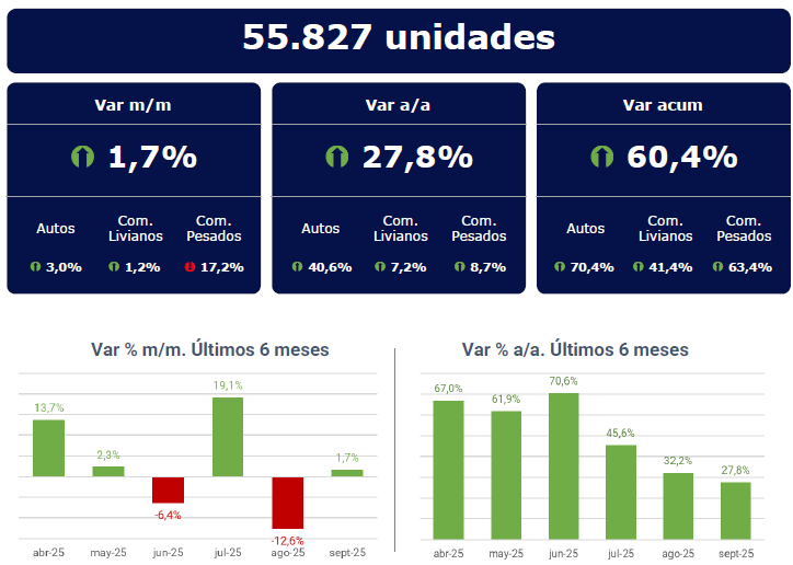 Durante el mes de septiembre se patentaron 55.827 vehículos, 1,7% más que en agosto y 27,8% más que en septiembre 2024. Así, los primeros nueve meses del año acumulan 500.089 vehículos 0km patentados, lo que equivale a un crecimiento del 60,4% respecto de 2024.
