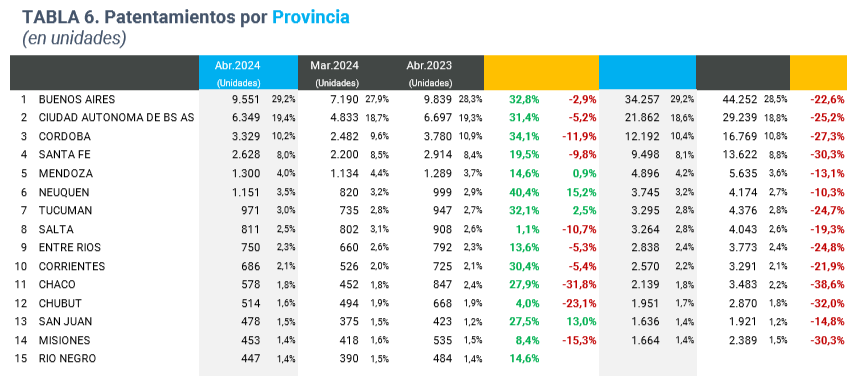 La provincia de Buenos Aires, con 9.551 patentamientos lidera el ranking, seguida por la Ciudad Autónoma de Buenos Aires con 6.349 y Córdoba completa el podio con 3.329 vehículos.