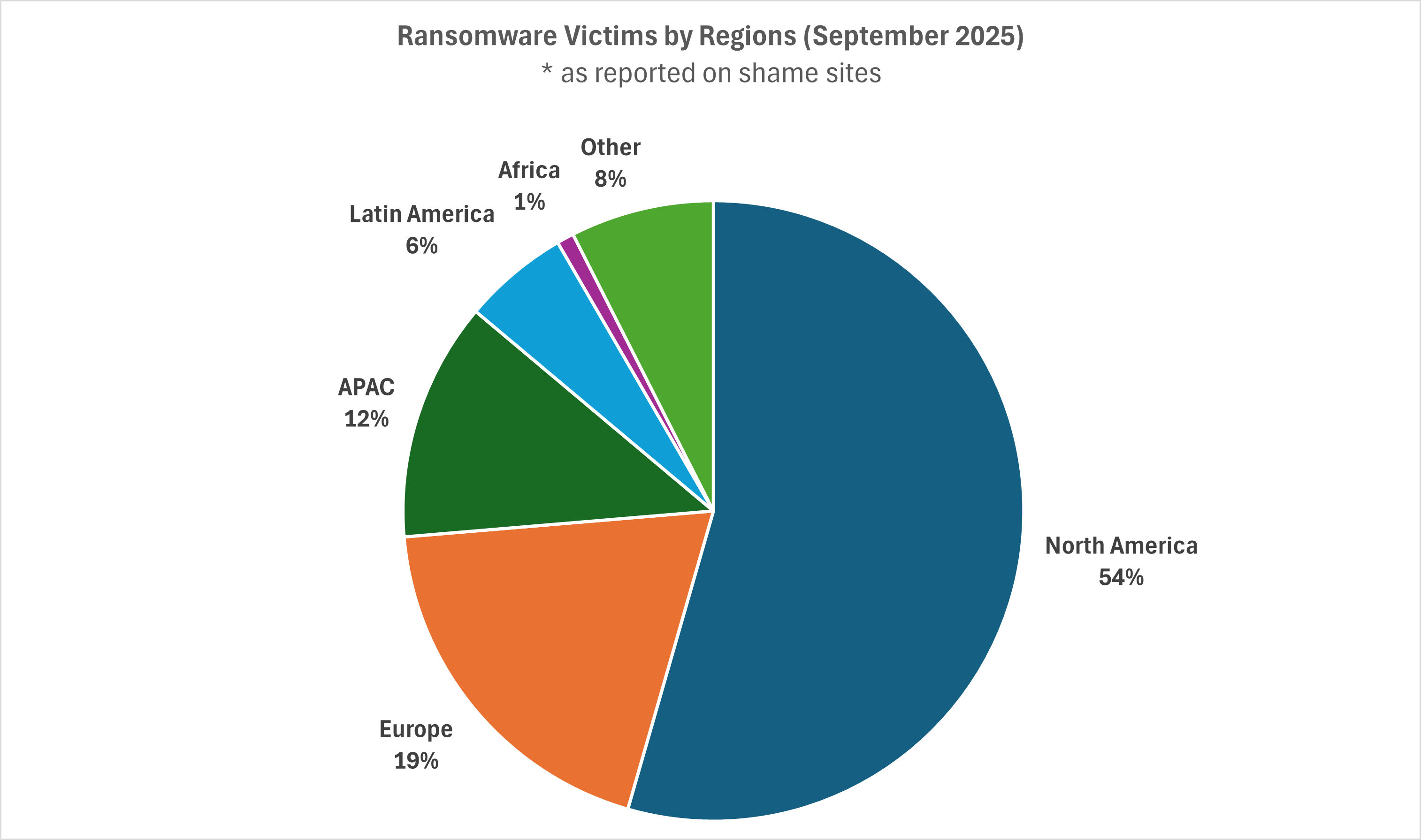 El ransomware se mantuvo como una de las ciberamenazas más disruptivas y perjudiciales para la economía, con 562 incidentes reportados públicamente a nivel mundial en septiembre, un aumento del 46% interanual. Norteamérica fue la región más afectada, con el 54% de los casos reportados, seguida de Europa (19%). Estados Unidos por sí solo representó el 52% de todos los casos de ransomware publicados, seguido de Corea (5%) y el Reino Unido (4%).