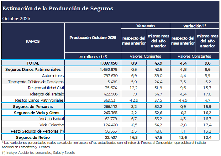 A través de la misma hace saber que la estimación de la Producción Total de Seguros para el mes de Octubre 2025 fue de 1,897 Billones de pesos, de los cuales el 86 % corresponde a los Seguros Patrimoniales, el 12,8% a los Seguros de Vida y Otros (Vida Individual/Colectivo y resto Seguros de Personas), y el 1,2% a los Seguros de Retiro.