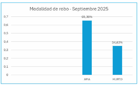 El informe confirma una tendencia que se mantiene firme: el robo a mano armada continúa siendo la modalidad predominante, representando el 65,38% de los casos. De estos hechos, el 94,12% ocurrieron en la vía pública, una constante que se repite mes a mes.