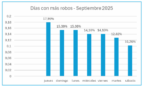 Al analizar los días de la semana en que sucedieron los robos, el jueves fue el día en el que más casos se registraron, con el 17,95%, seguido por el domingo y lunes (15,38%). Miércoles y viernes se mantuvieron en niveles iguales (14,10%), mientras que el martes (12,82%) y el sábado (10,26%) fueron los días con menos actividad delictiva.