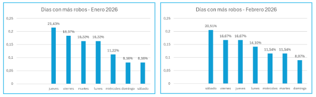 Respecto a los días de la semana, el comportamiento de los robos muestra variaciones entre ambos meses, aunque con cierta concentración hacia el final de la semana. En enero, los jueves se posicionaron como el día más crítico, concentrando el 21,43% de los casos, seguidos por los viernes (18,37%). Sin embargo, en febrero el pico se trasladó al sábado, que pasó a liderar con el 20,51%, mientras que jueves y viernes compartieron el segundo lugar con el 16,67%.