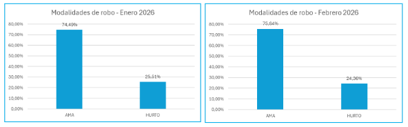 Durante el verano, la modalidad a mano armada fue la más utilizada por los delincuentes: representó el 74,49% de los casos registrados en enero y el 75,64% en febrero. El hurto sostuvo porcentajes similares durante ambos meses alcanzando el 25,51%, y 24,36% respectivamente.