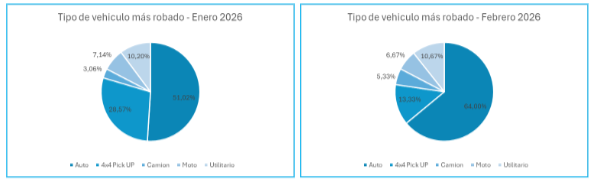 Según muestra el informe, los autos particulares siguen siendo el tipo de vehículo más buscado con el 57,5% de los casos totales y un aumento del 25,5% de enero a febrero. Las 4x4 Pick UP mantuvieron una alta participación durante el primer mes con el 28,57% y reflejaron una baja en el segundo mes del año alcanzando el 13,33%. Más atrás se ubicaron las motos (7,14% y 6,67%), los utilitarios (10,20% y 10,67%) y los camiones, que representaron el 3,06% en el primer mes y el 5,33% en el segundo.