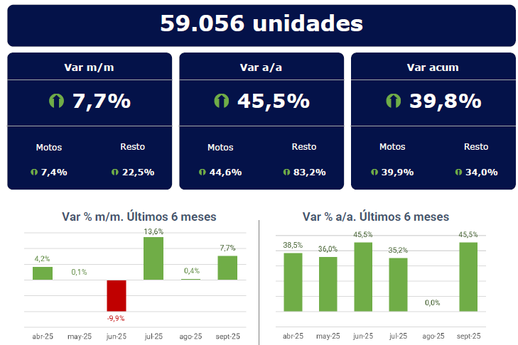 Durante el mes de septiembre se patentaron 59.056 motovehículos, 7,7% más que en agosto y 45,5% más que en septiembre 2024. Así, los primeros nueve meses del año acumulan 474.575 motovehículos 0km patentados, lo que equivale a un crecimiento del 39,8% respecto de 2024.