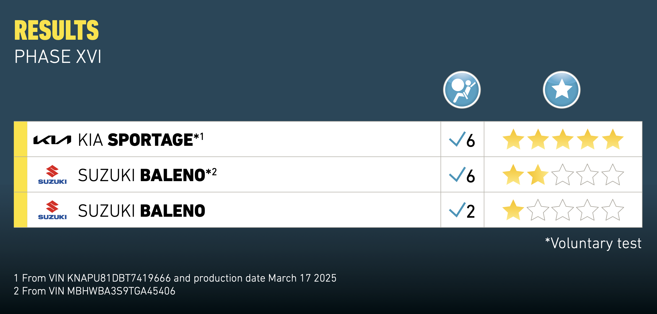 El Programa de Evaluación de Vehículos Nuevos para América Latina y el Caribe, Latin NCAP, publica hoy la novena y última ronda de resultados del año 2025. Estos resultados muestran a Suzuki con una gran reacción tras la selección de la versión de dos bolsas de aire del Baleno, calificada con una estrella, y la estandarización de la versión de seis bolsas de aire, obteniendo dos estrellas. El renovado Kia Sportage obtuvo cinco estrellas. Estos son los últimos resultados antes de la actualización del protocolo de evaluación de Latin NCAP en 2026 donde se implementarán importantes mejoras de seguridad.