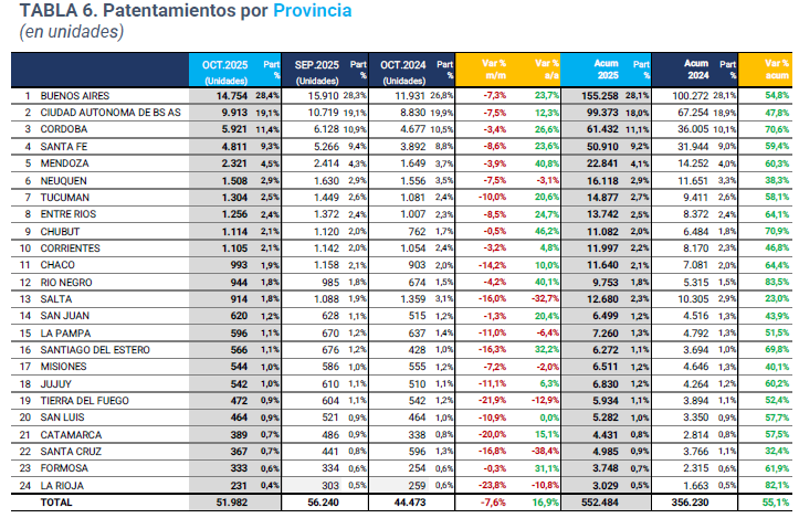 Durante el mes de octubre se patentaron 51.982 vehículos, 7,6% menos que en septiembre y 16,9% más que en octubre 2024. Así, los primeros diez meses del año acumulan 552.484 vehículos 0km patentados, lo que equivale a un crecimiento del 55,1% respecto de 2024.