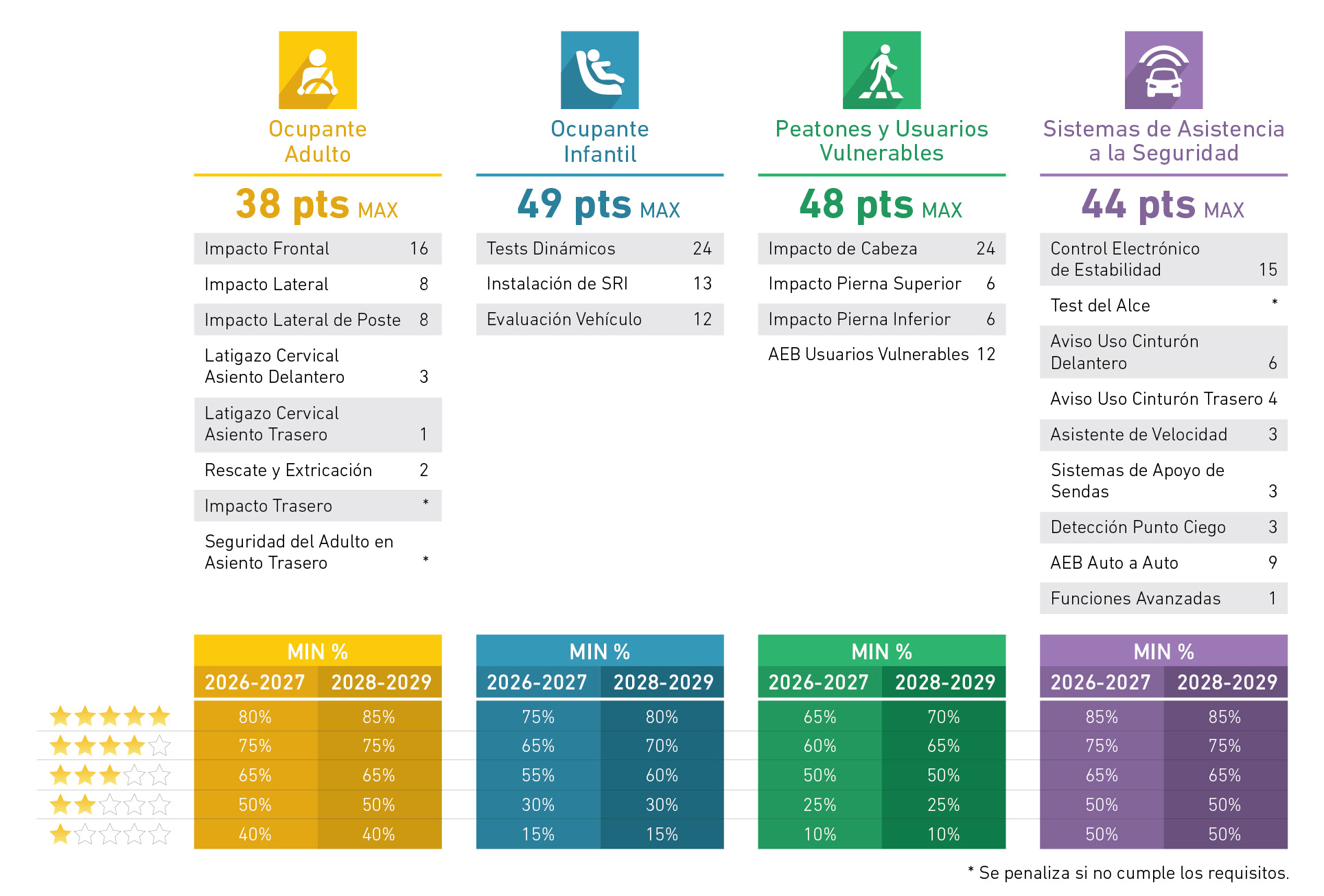 En esta actualización del protocolo de Latin NCAP se aumentan los requisitos necesarios para obtener estrellas a la vez que se penaliza la falta de aspectos básicos de seguridad, manteniéndose las 4 grandes áreas de evaluación: 1) Protección de Ocupante Adulto, 2) Protección de Ocupante Infantil, 3) Protección a Peatones y Usuarios Vulnerables de las Vías y 4) Sistemas de Asistencia a la Seguridad. La actualización del protocolo entra en vigor el 1ro de enero de 2026 y regirá hasta diciembre del 2029.