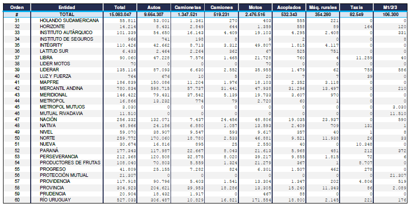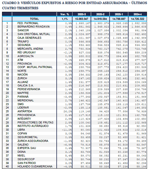 Federación Patronal es la aseguradora con mayor cantidad de vehículos asegurados, seguida por Seguros Rivadavia, Sancor, San Cristóbal y La Caja completan el top five.