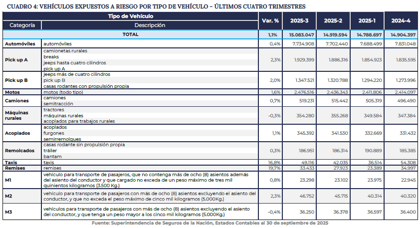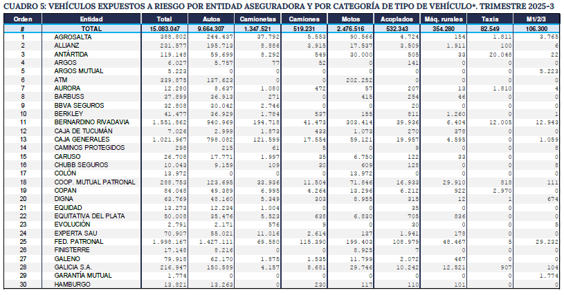 La Superintendencia de Seguros de la Nación a través de la Circular Informativa IF-2025-136472492-APN-GEYE#SSN de fecha 10 de Diciembre de 2025 publicó los Vehículos Expuestos a Riesgo al 30 de Septiembre de 2025.